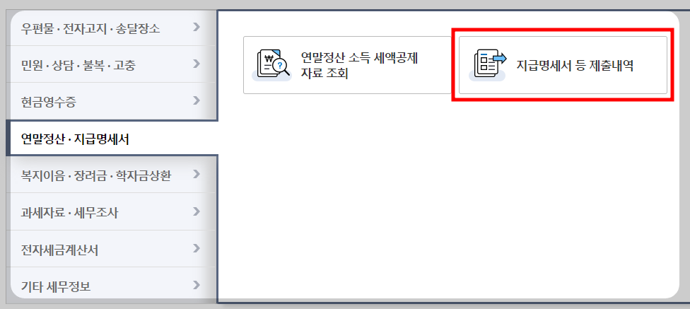 근로소득 원천징수 영수증을 발급받는 방법은 회사에 요청하는 방법만이 있다고 생각하시는 분들이 대분분일겁니다. 회사에 요청하는 방법 말고도 본인이 직접 신청해서 근로소득 원천징수 영수증 발급 받을 수 있는 방법이 있습니다. 홈택스에 접속하여 로그인을 합니다. 로그인이 되었다면 My홈택스로 들어가 연말정산ㆍ지급명세서 항목에서 지급명세서 제출내역을 클릭해줍니다.