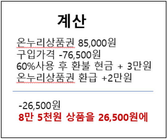 그러면 최초의 7만 6500원으로 온누리 상품권을 구입했지만, 잔액을 현금으로 받으면 현재 현금 3만원이 남았고 행사에서 온누리 상품권 2만 원을 받았으니 지출금액은 2만 6500원이 됩니다. 8만 5000원 하는 상품을 거의 3분의 1도 안 되는 가격에 구입할 수 있는 겁니다. 최대치로 계산한 거긴 하지만 고물가 시대에 확실히 가장 많이 절약할 수 있는 방법입니다.
